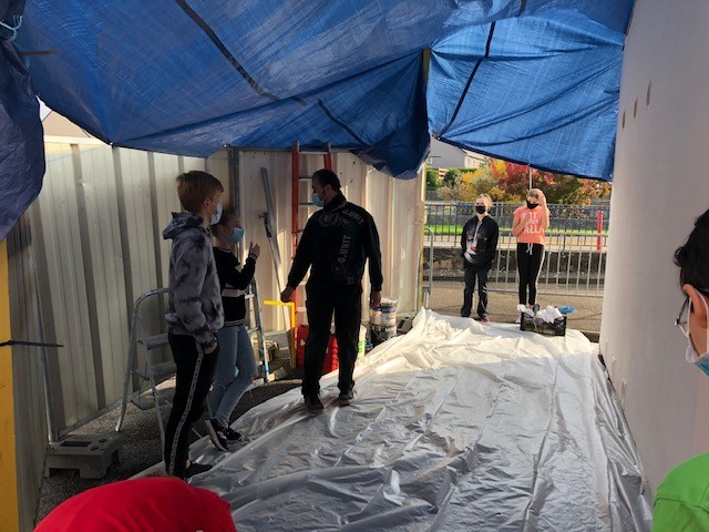 Le projet est en cours depuis un an. Il a été financé par l’organisation du marché de Noël, en décembre 2019. Boubaker Derkaoui tient à souligner l’implication de plusieurs partenaires : l’APEEM, qui a aidé au financement, la municipalité, l’équipe technique de la mairie qui a installé des bâches pour mettre ce côté du mur à l’abri des intempéries… Et des curieux ! La fresque devrait être terminée ce 23 octobre.