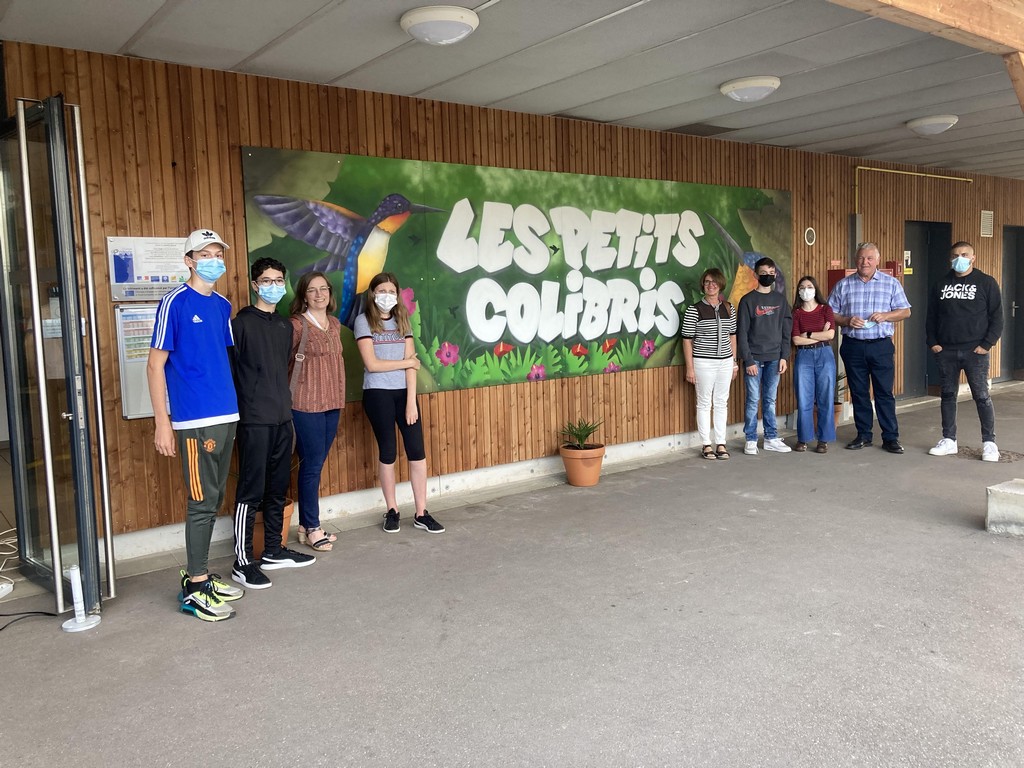 C'est ainsi que le 02 juillet 2021, en présence de l'équipe d'animation, de représentantes du corps enseignant du Groupe Scolaire Jean Moulin, de la Coordinatrice des PEP LOREST, de jeunes du club ado qui ont réalisé la fresque pendant les vacances scolaires de février à l'aide de Mourad, intervenant de la compagnie DEAP Fusion, le nom des "PETITS COLIBRIS" a enfin été officialisé ! |